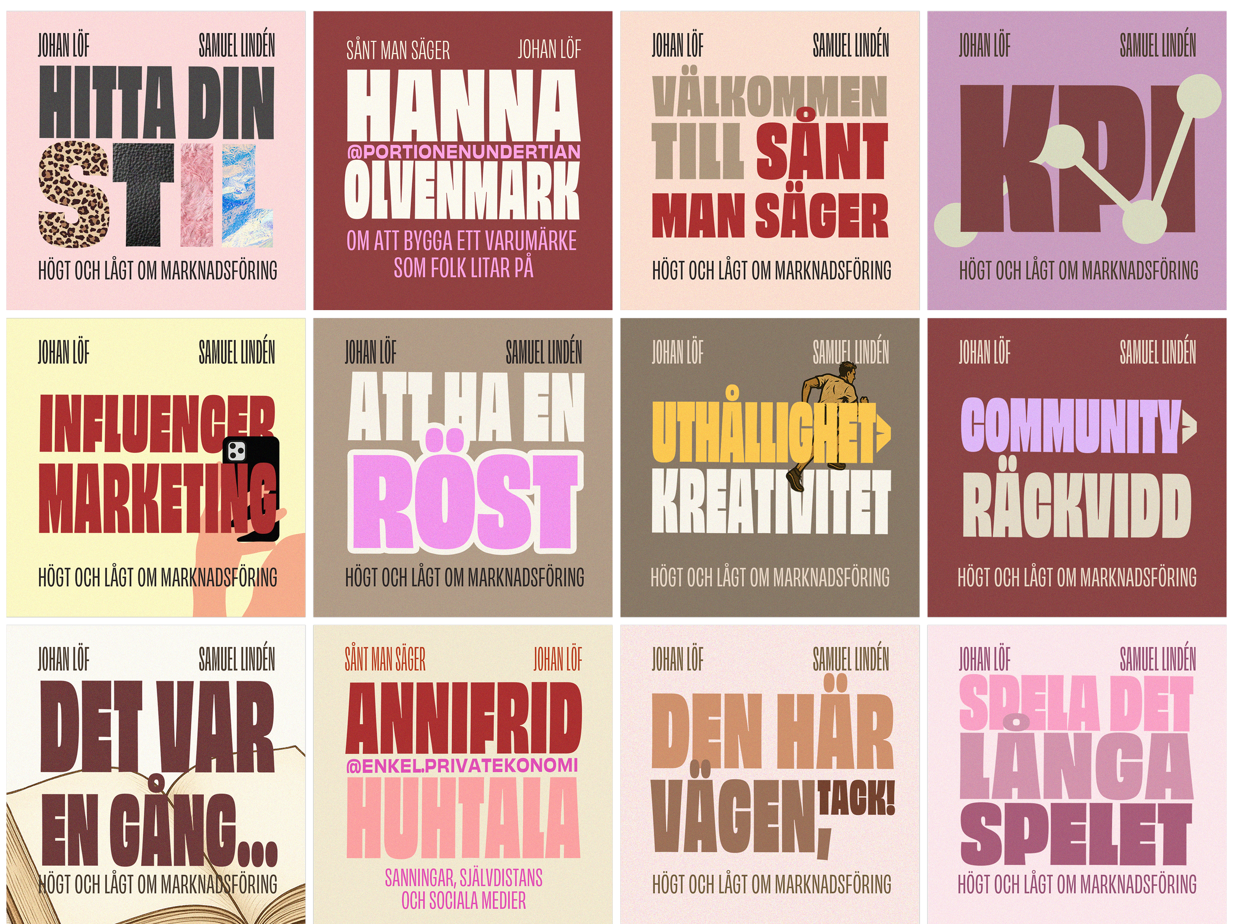 The podcast “Sånt man säger” airs weekly and needed a concept featuring a fresh design for each episode. The solution was a series of movie-poster-inspired visuals, each centered around the episode title. The color palette stays within a consistent range of tones, while varying combinations create both recognizability and a unique look for every episode.